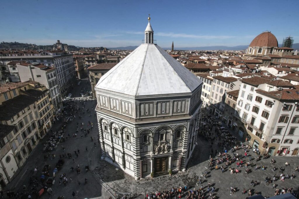 Położone naprzeciwko Duomo baptysterium jest arcydziełem florenckiej architektury romańskiej. Ze swoim charakterystycznym ośmiokątnym plan em i okładziną z białego marmuru Carrara i zielonego marmuru Prato, jest to jeden z najstarszych budynków w mieście. Ale jak stary?