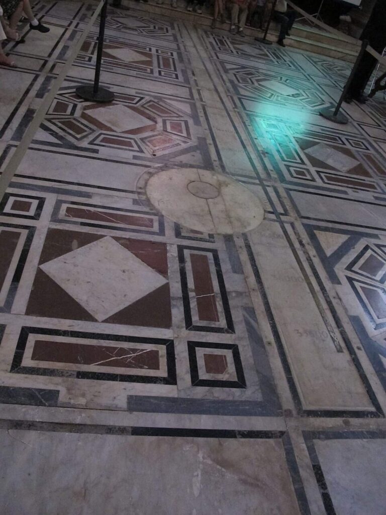Otwór o średnicy 4 centymetrów otwarty na 90 metrów w latarni kopuły Brunelleschiego: to gnomon Santa Maria del Fiore. Przez niego światło słoneczne oświetla marmurową linię zegara słonecznego na podłodze katedry.