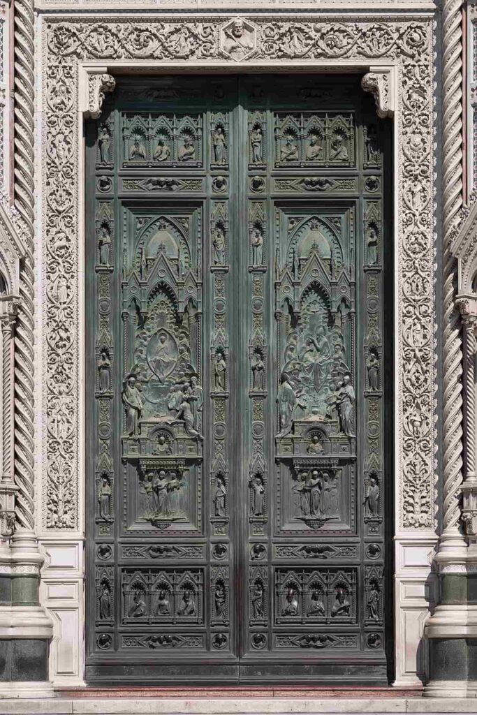 W systemie dekoracyjnym fasady Santa Maria del Fiore, drzwi z brązu i mozaiki w lunetach są bardzo ważne, ponieważ ilustrują życie Dziewicy, tematyczne i wizualne centrum całego dzieła.