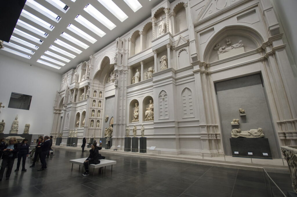 Jednak Arnolfo zdążył już udekorować podstawę aż do portali i wyrzeźbić serię arcydzieł, z których jednym jest„Madonna ze szklanymi oczami„, która jest obecnie przechowywana w Museo dell’Opera, po jej zburzeniu w 1587 roku.